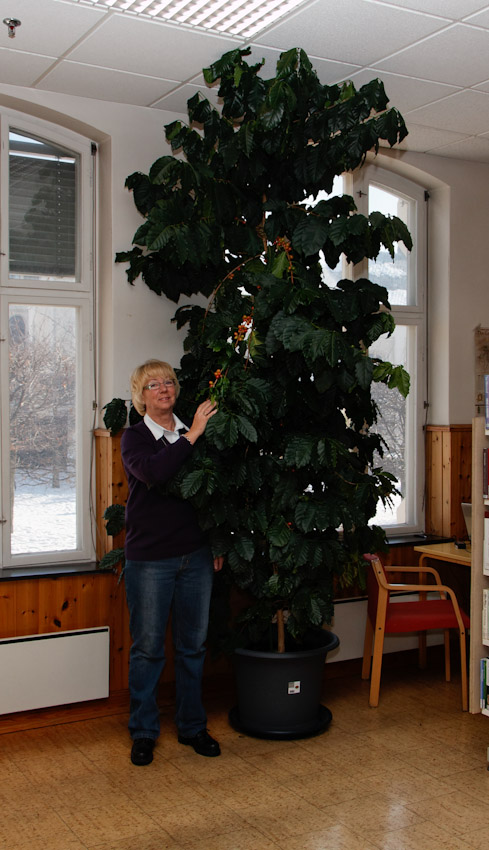 På Halden bibliotek har de i lengere tid hatt en kaffeplante som bare har blitt større og større og nå er det også store klaser med kaffebønner på den. Som dere kan se av bildet har den vokst helt opp i taket. Biblioteket er også på jakt etter et nytt hjem til planta da den er i ferd med å bli for stor.