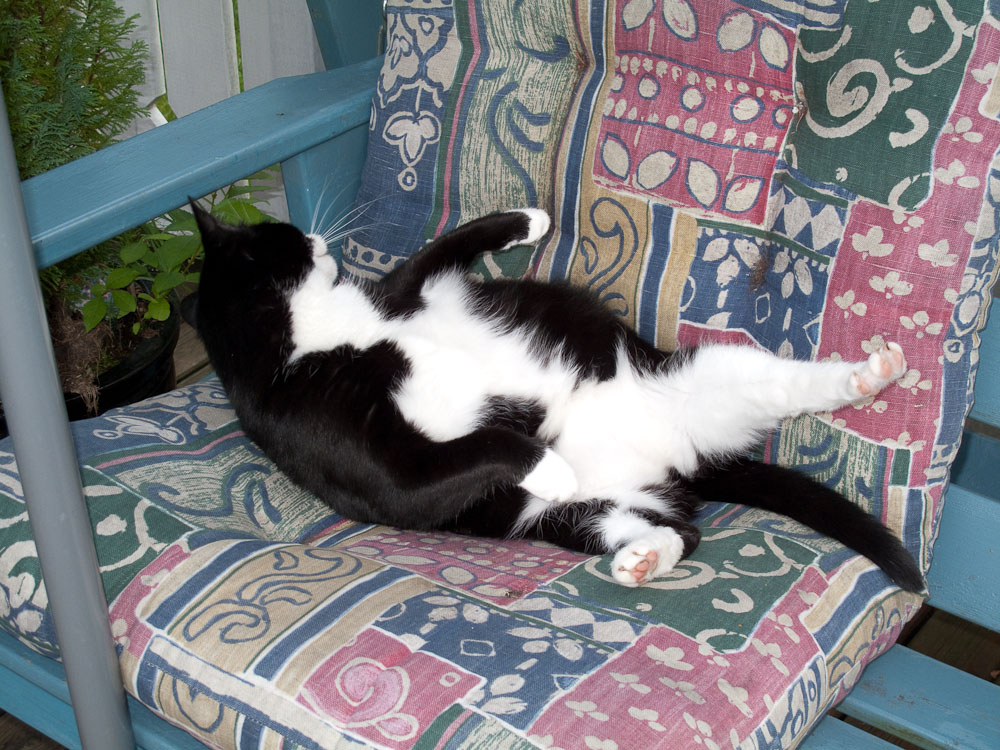 I dag satt han seg til rette på trappa og jeg ruslet inn etter kameraet for å prøve å ta et bilde. Han satt så rolig og bare nøt morgensola og da jeg gikk inn ble han like godt med meg inn igjen. Ikke noe morgenstress med den katten nei. Så her sitter vi da og nyter en stille morgen sammen mens Discovery HD viser solopgang fra forskjellige steder i verden.