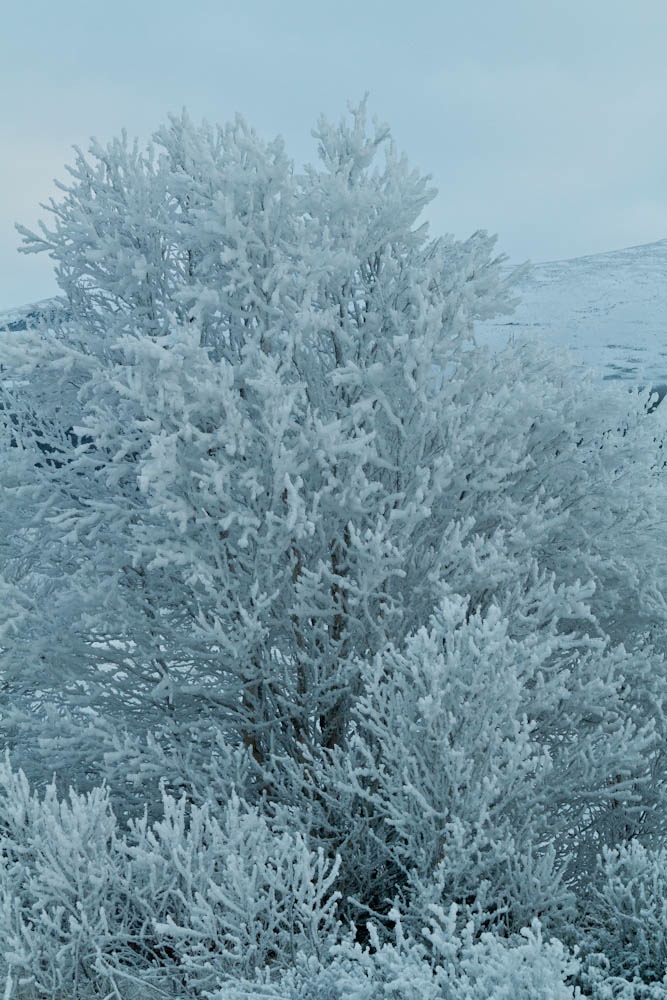 Trærne var fulle av frost og rim og så kalde ut. Temperaturen var ikke lav, bare ca. -6, men det var nok til å legge et skikkelig rimdekke på trærne.