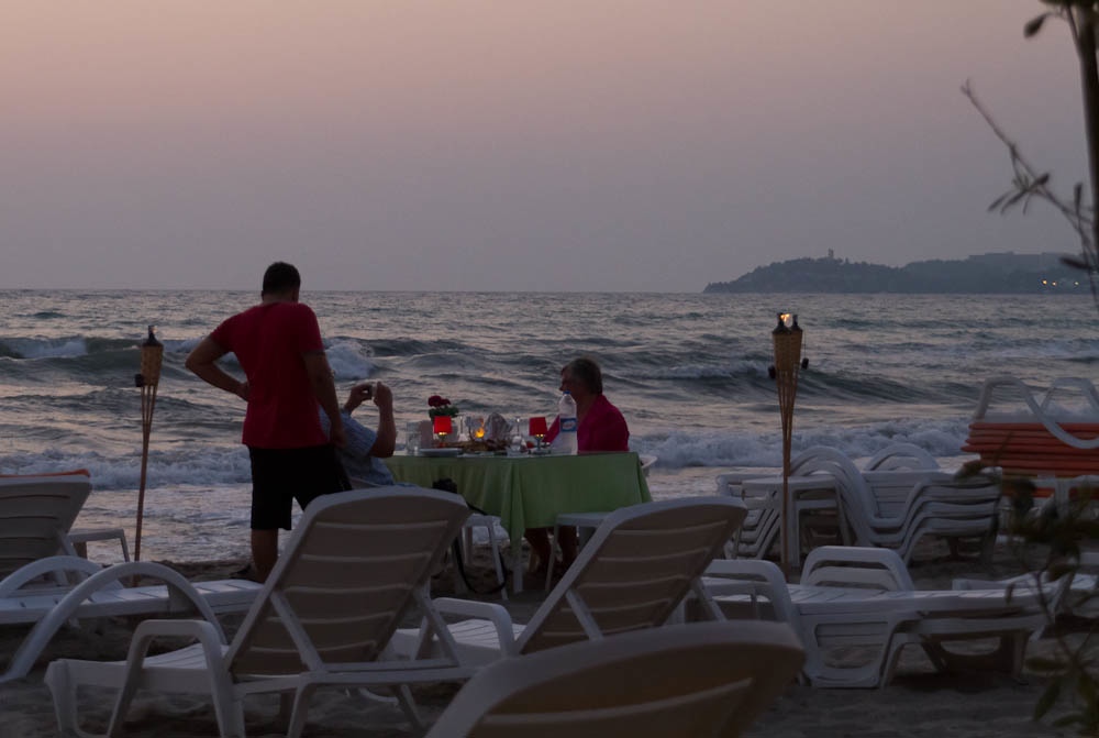 Litt senere på dagen dro kona og jeg en tur ut til de nye basarbygningene ved Long Beach for å titte litt. Det var mye bra å velge i her, men for første gang måtte hun bite i det sure pruteeplet. Hun tapte! Hun hadde plukket varer for 32 1/2 TRY og begynte på 25, men selgeren stod på sitt. Han gikk ikke en «øre» under 30 og Stine stoppet på 28. Det ble ingen handel. Selgeren var så gjennomført sur at selv andre tyrkere i butikken gikk uten å handle med ham, så det var nok ikke bare kona som sparte penger her.