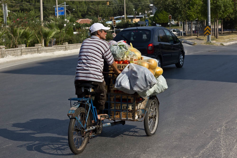 Tirsdag er ikke noen dum dag. Tyrkere finner alltid på en grunn til å ha marked, slik også på en tirsdag. Da er det lokalt marked rett ved hotellet og utvalget kan ingen klage på. Her var det ferskner fra Sirince som det gikk tre stk av på en kilo. Altså litt større enn dem du vanligvis ser hjemme. Luktene er som en eksplosjon i hjernebarken. Det var vel Aukrust som brukte uttrykket «som å slå selters rett i hjernbarken»? Nå spraker det ikke så mye her, men luktkaoset er herlig. Klær, frukt og grønnsaker forenes i en forykende rapsodi hvor det ropes «Üç kilo bir million»(3 kg for en 1 TRY) i den ene enden til noe totalt atonalt og uforståelig i den andre enden. Ikke skal jeg ha det heller.