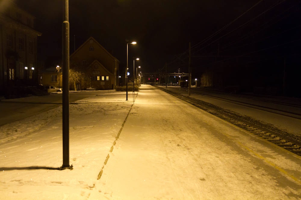 Langt nede på perrongen skimtes stasjonbygningen i mørket. Alle bildene er tatt med Canon 7D på 3200 ISO og litt behandlet i Lightroom. Jeg er veldig fornøyd med dette kameraet når det gjelder å ta bilder i lite lys.