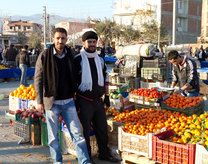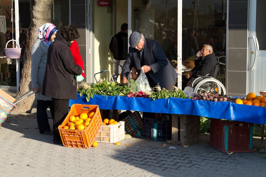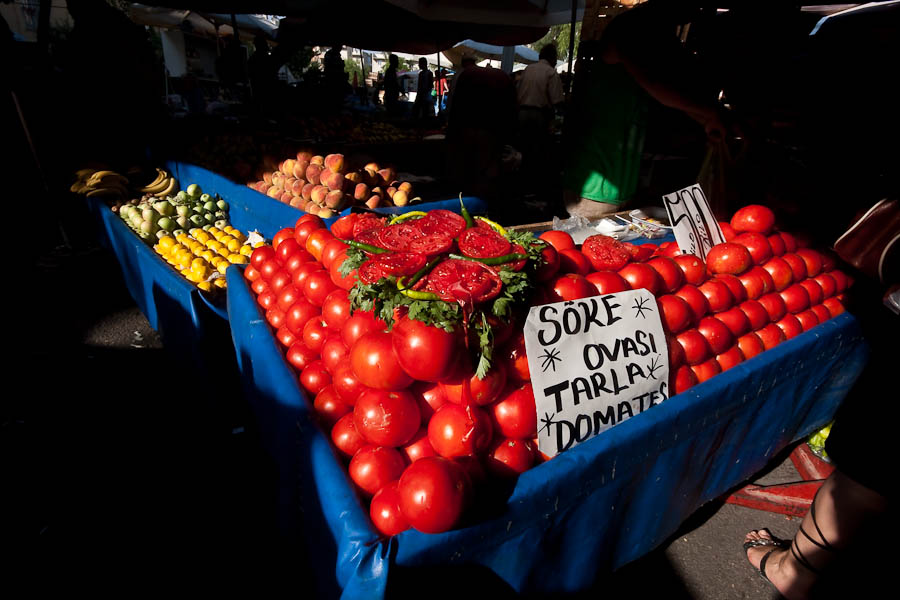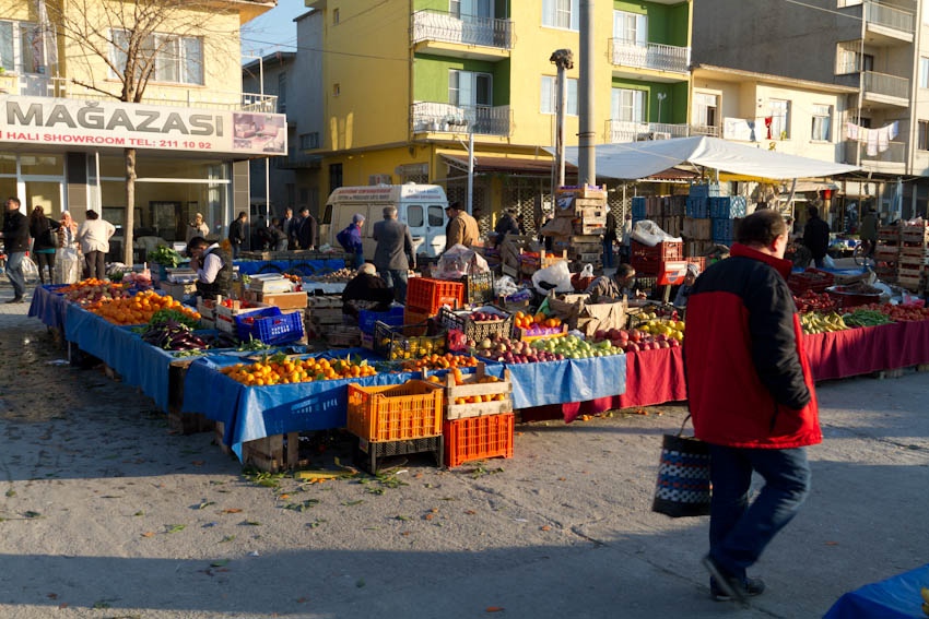 Tirsdag er ikke noen dum dag. Tyrkere finner alltid på en grunn til å ha marked, slik også på en tirsdag. Da er det lokalt marked rett ved hotellet og utvalget kan ingen klage på. Her var det ferskner fra Sirince som det gikk tre stk av på en kilo. Altså litt større enn dem du vanligvis ser hjemme. Luktene er som en eksplosjon i hjernebarken. Det var vel Aukrust som brukte uttrykket «som å slå selters rett i hjernbarken»? Nå spraker det ikke så mye her, men luktkaoset er herlig. Klær, frukt og grønnsaker forenes i en forykende rapsodi hvor det ropes «Üç kilo bir million»(3 kg for en 1 TRY) i den ene enden til noe totalt atonalt og uforståelig i den andre enden. Ikke skal jeg ha det heller.