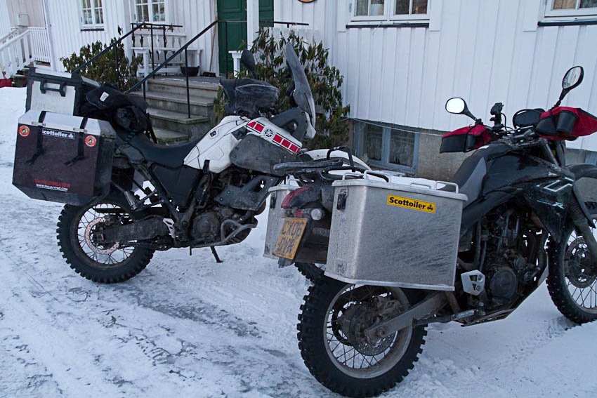 Det så kaldt ut og det var kaldt, men på Grong Gård traff jeg fem tøffe engelskmenn som hadde vært på MC-treff litt lenger nord i landet. De var godt utstyrt og hadde sikkert hatt en topp tur i et vinterkledd landskap. Nå var de på vei sydover igjen. Jeg har ingen erfaring fra vinterkjøring med sykkel og kommer nok aldri til å få det heller. I yngre dager kjørte jeg en del stor motorsykkel og det hender jeg prøver i ny og ne, men vinterkjøring frister ikke.