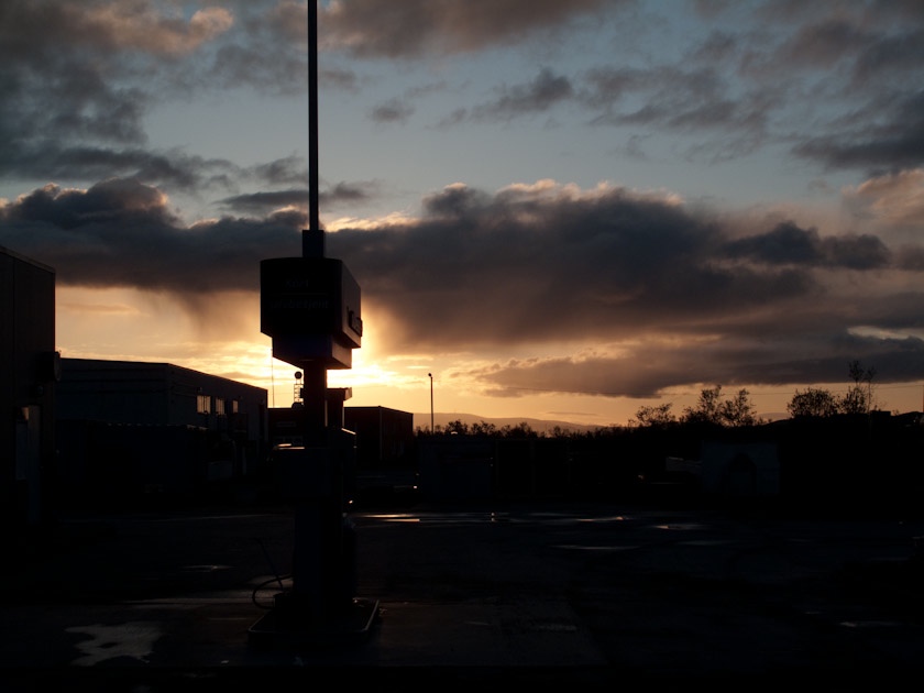 På baksiden av kroa så det slik ut. For å slippe og fotografere sola direkte la jeg den bak pumpa på stasjonen og fikk i stedet en flott himmel. Tempreaturen var topp og det var ikke lett å legge seg, men fornuften tok over. En dag i morgen også:-)