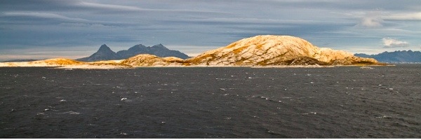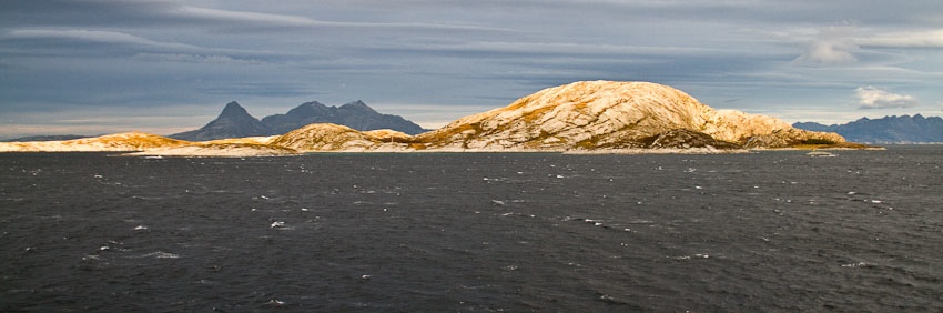 På veien oppover tittet sola stadig frem og enkelte ganger da jeg hadde tid til å stikke i fra var det bare å gå på dekk med kamera og håpe på at det var noe å ta bilder av. Bildet er et slik knips som ble tatt i all hast da jeg tittet ut og fikk se sola gylle på øya der fremme foran båten.