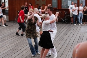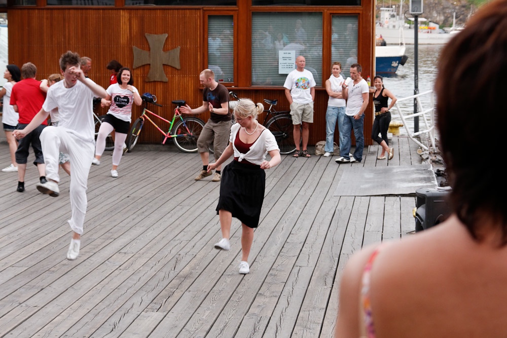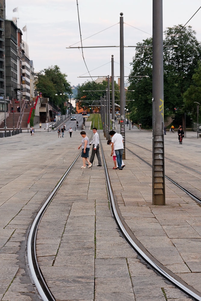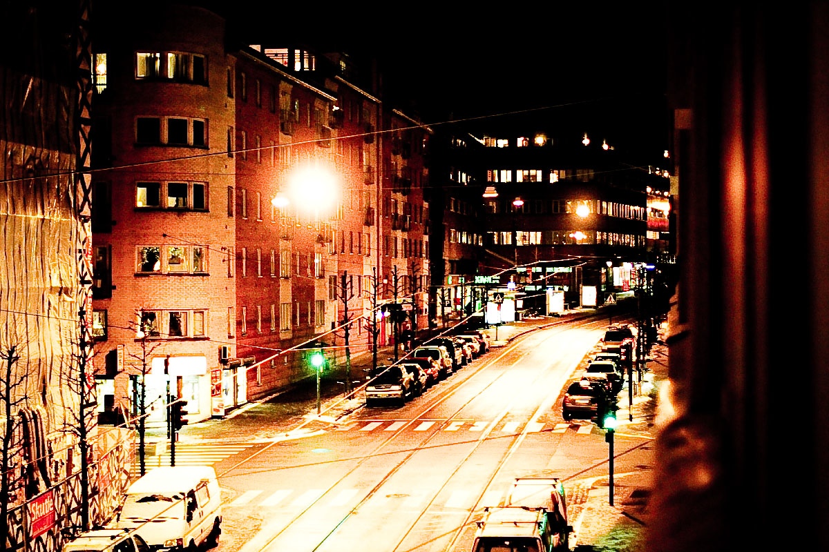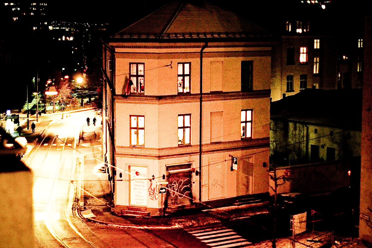 Oppover Trondheimsveien står det en god del biler parkert, det bor jo noen mennesker her og sjåføren prøver å få rompa på leddbussen inn i Solhaugsgata. På puben stiger spenningen og ryggingen kommenteres hjertelig. Å rygge en leddbuss inn i den gatestumpen krever at man vet hvilken vei rumpa på bussen peker. Etter å ha benyttet ryggelys i 15-20 minutter fikk passasjerene nok og forlot bussen. Ute regnet det friskt og vi nøt forestillingen under markisen som tross alt dempet regnet, men ikke teateret. Det ble nok en del bløte katter som trasket oppover mot Carl Berner.