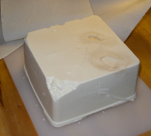 Denne klumpen har akkurat kommet ut av en 3-liters isboks. Blokka med såpe skal nå tørke noen uker før den behandles videre. Kona lager såpe helt fra bunnen ved å blande lut, vann og olje Det er en slik blokk som her er «ferdig». Når såpa ikke lenger biter på tunga ansees den som ferdig og da blir den revet opp, smeltet om og tilsatt nye stoffer som lukt og oljer av diverse slag. Stine bruker olivenolje, palmeolje og kokosolje som basisoljer.
