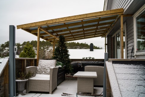 Dennes nøen ligger nok ikke lenge og strkas er det vel bare slaps og søle igjen. Juletreet gjør seg godt på verandaen. Det ble ikke mye pynt på treet, men siden det skal stå ute så passer det bare med lys og det synes fint på kvelden.