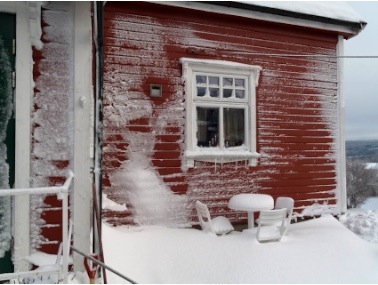 Veggen borte hos kameraten min så akkurat ut som husveggene jeg har sett i Finnmark etter en omgang med snøblandet vind. Det har kommet litt nedbør i natt også og tempen holder seg ca. på -8. Været har vært topp de to siste dagene og i dag har sola skint også. Postkortmotiv har stått i kø, men jeg gikk ikke ut med kameraet idag, bortsett fra at jeg knipsa dette med lommekameraet mitt.
