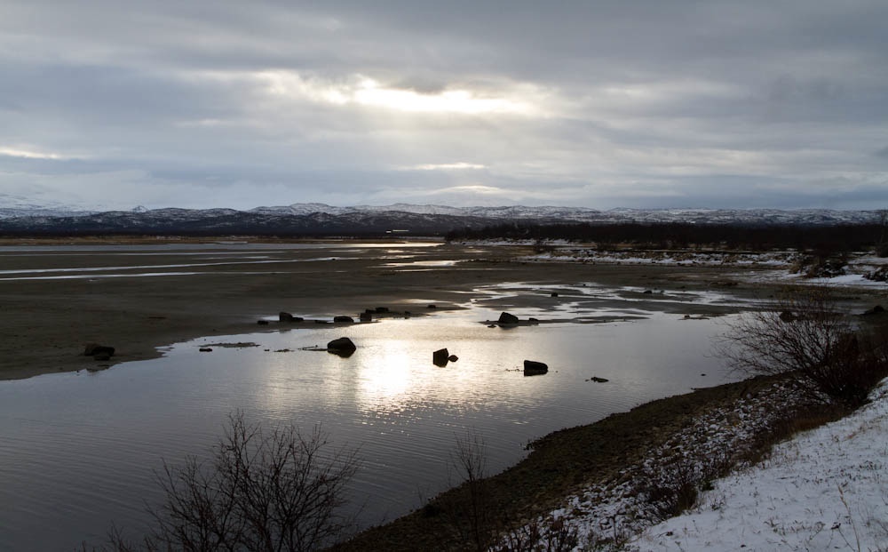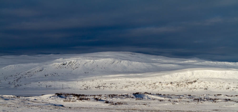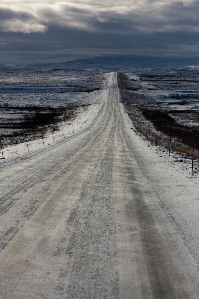 Veien sydover fra Kiruna var likevel ikke lett å kjøre på. Kritthvite veier uten sand på var både glatte og totalt kontrastløse. Fartsgrensa på disse veiene var for det meste 100, men jeg syntes 70-75 var helt passe noe de fleste andre syntes også. Etterhvert kom sola opp og været var helt topp, slik som bildet viser og da ble det lettere å se veien også.