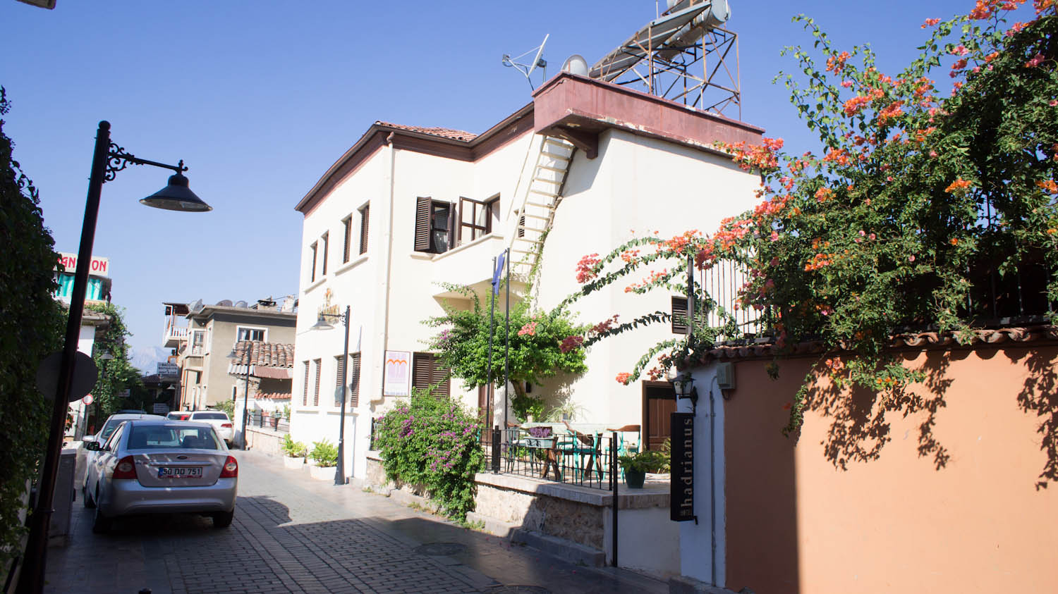 Dette er hotell med få stjerner og ingen luksushotell, men du verden for en service. Hadrianus ligger midt i gamlebyen i Antalya og det er kort vei til det meste her. Stranda, (Mermeli) ligger bare 3 minutter unna. Det er en liten privat strand og koster bare 10 TRY (36,-) pr. person for hele dagen. Da får du solseng og parasoll med.