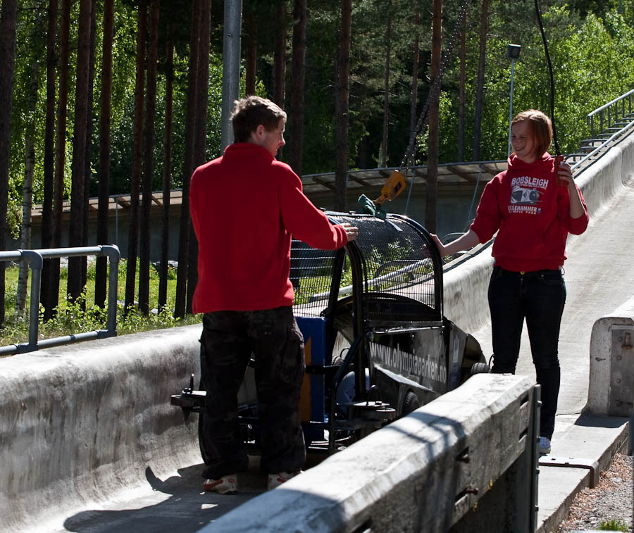 Her er en av bobene kommet frem til mål og den løftes av banen og settes på en henger for og fraktes opp til toppen. Banen har en høydeforskjell på cal 110m. Det gikk fort, ca. 100km i timen og du kunne virkelig kjenne kroppen bli tynget ned i de skarpe svingene. På det meste opplever du 3G.