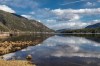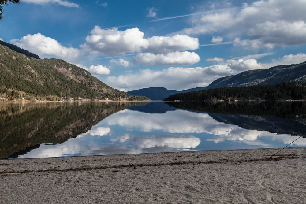 Øverst ser du en flott strand i Byglandsfjorden, men normalt ligger den langt under vannet. Hele fjorden er tappet ned av det lokale e-verket og det ser ikke pent ut.
